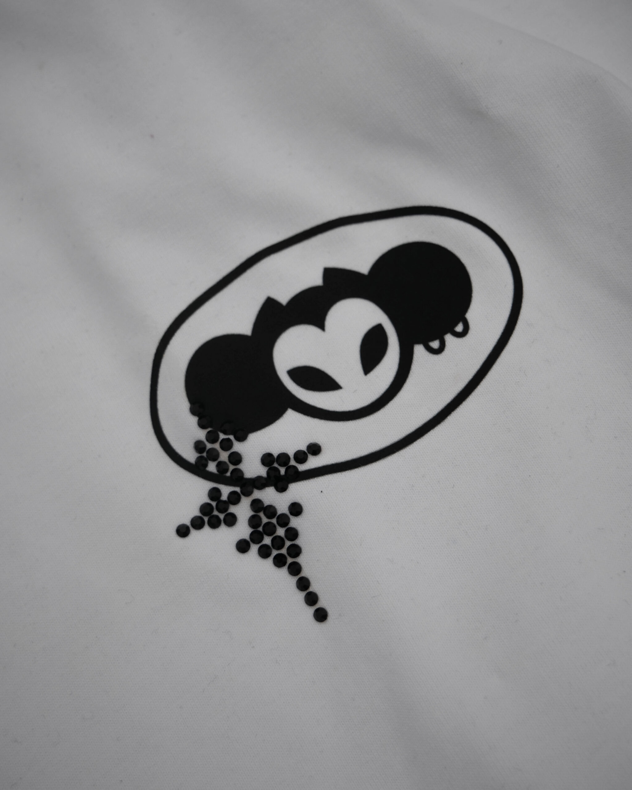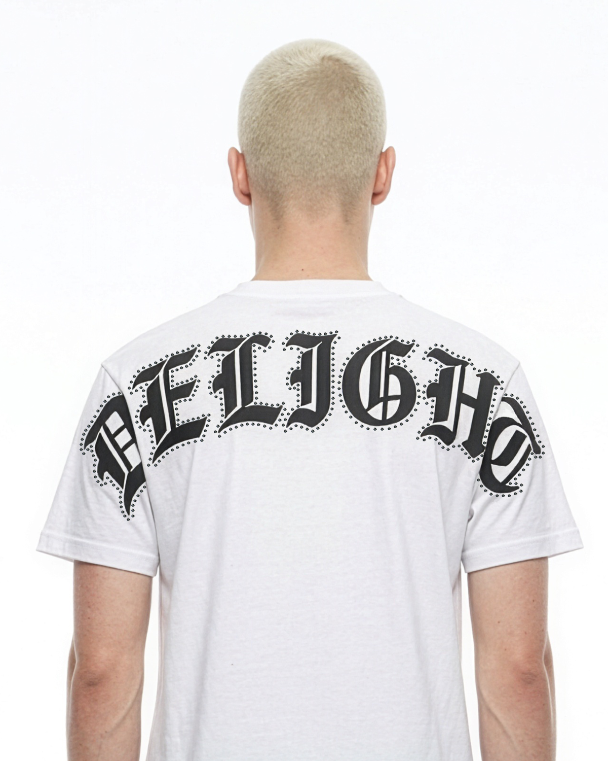 Mặt sau nổi bật với typography DELIGHT gothic cỡ lớn, kết hợp đính cườm đá viền xung quanh chữ, tạo hiệu ứng bắt sáng nhẹ khi di chuyển – vừa đủ nổi nhưng không bị “over”.