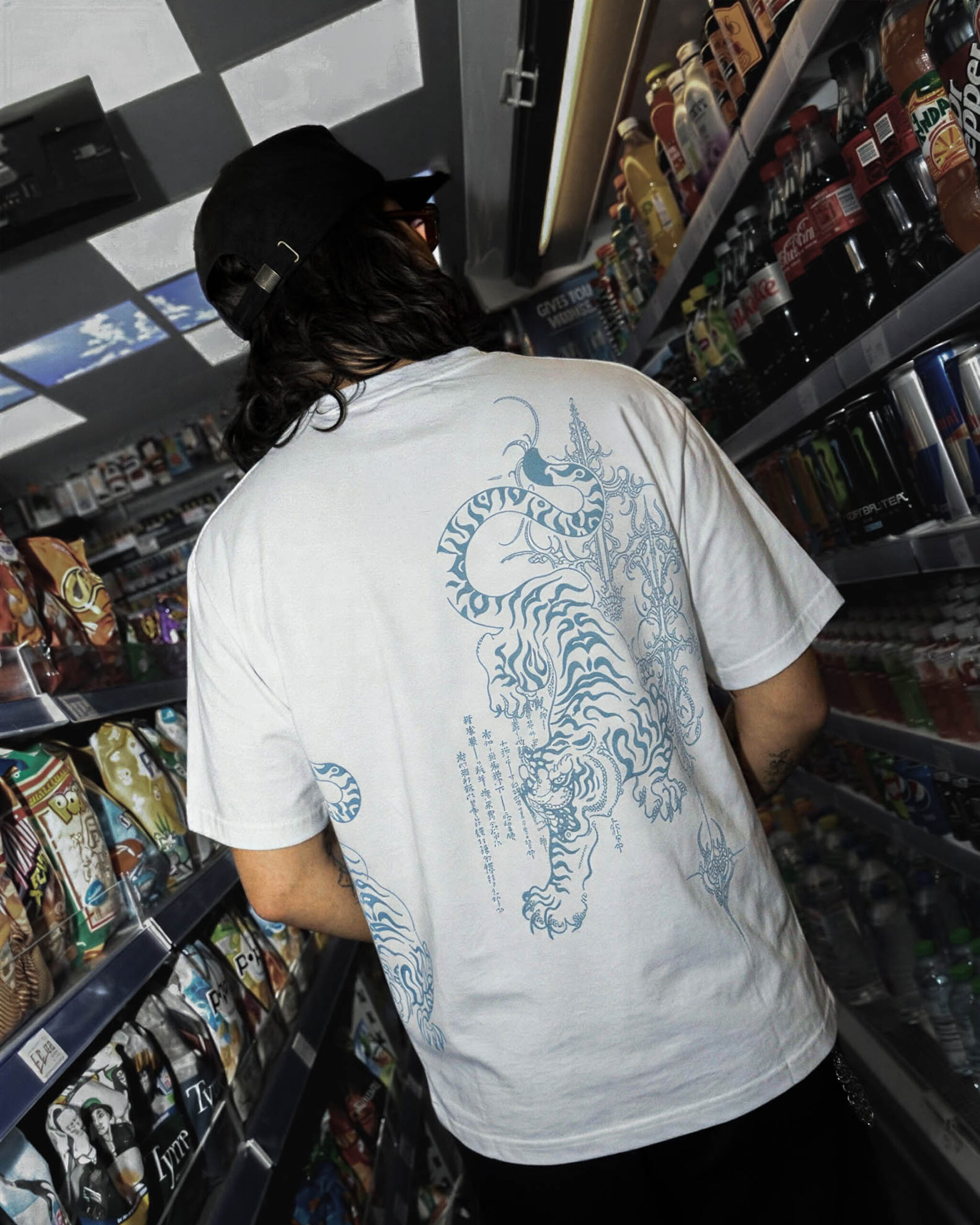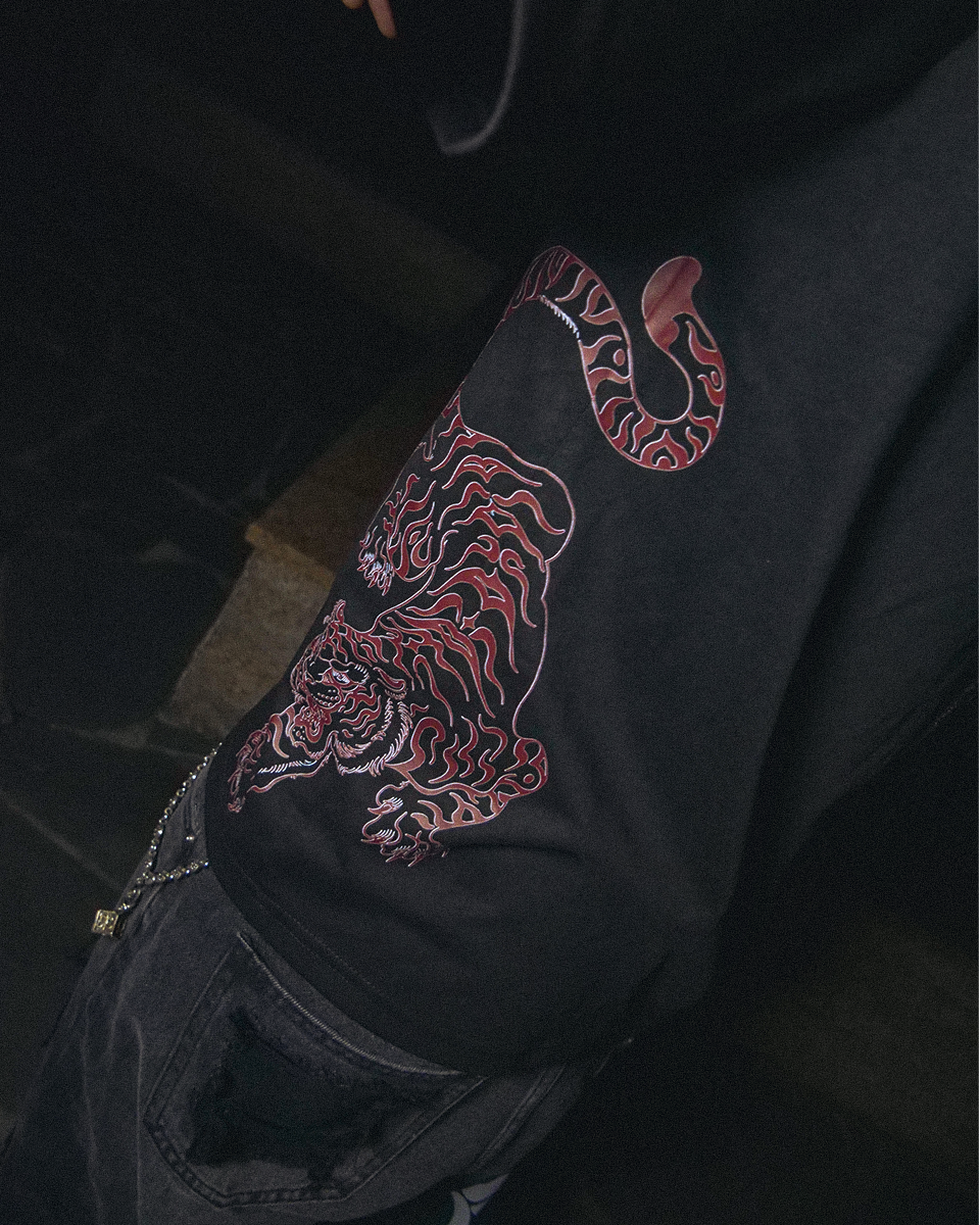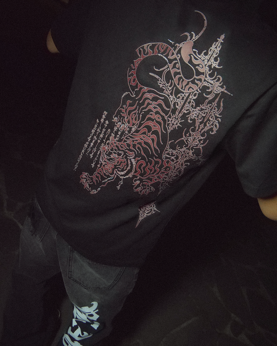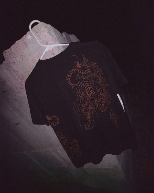 Mặt sau: Điểm nhấn đặc biệt của chiếc áo nằm ở hình in rồng-phượng tinh xảo ở lưng. Hình in được thực hiện theo kỹ thuật Line Art (Vẽ nét) với màu sắc đối lập (trắng trên nền áo hổ phách hoặc ngược lại), mang đậm nét truyền thống Á Đông nhưng được cách điệu đầy hiện đại.