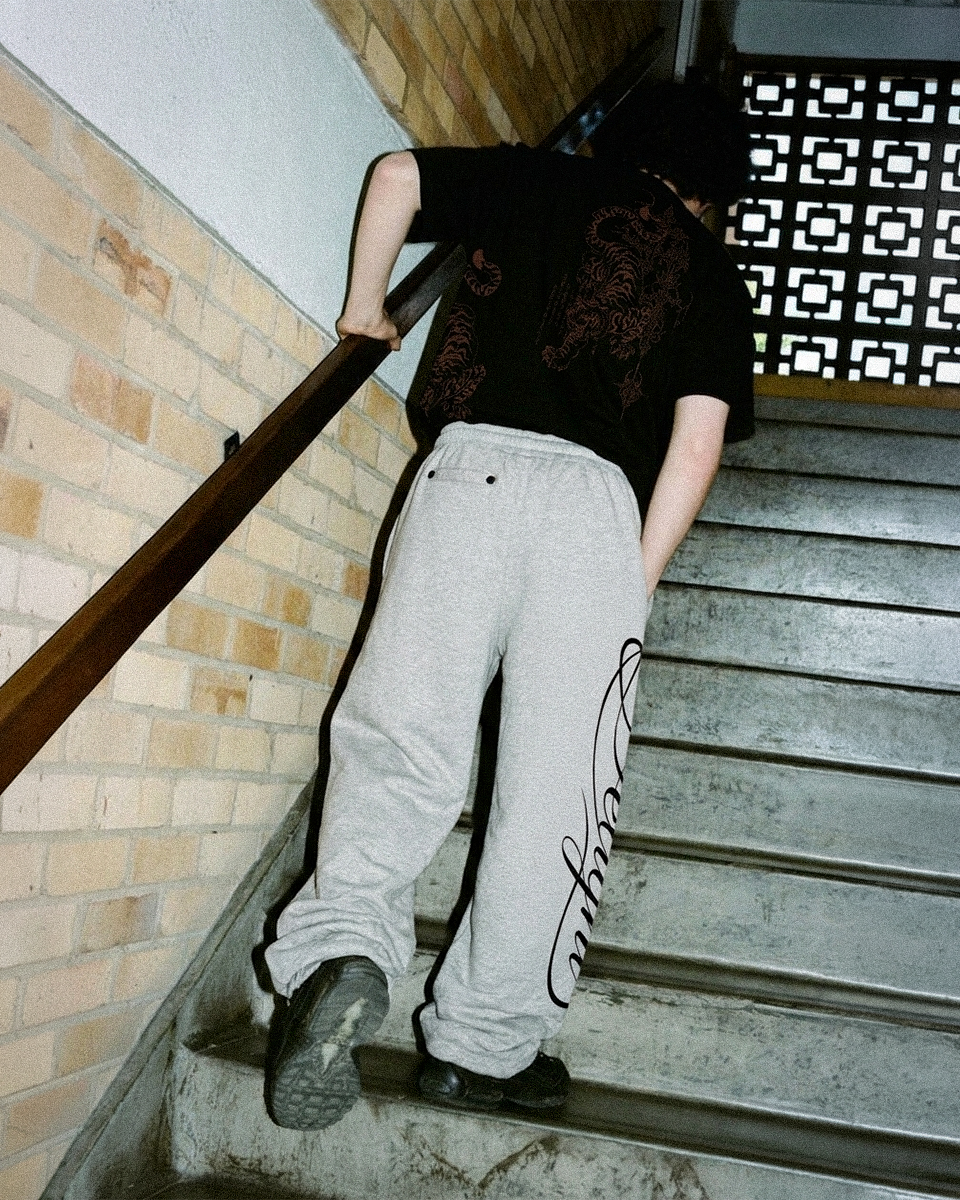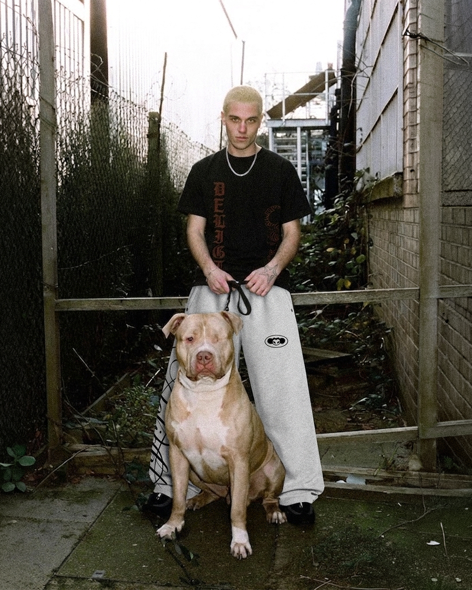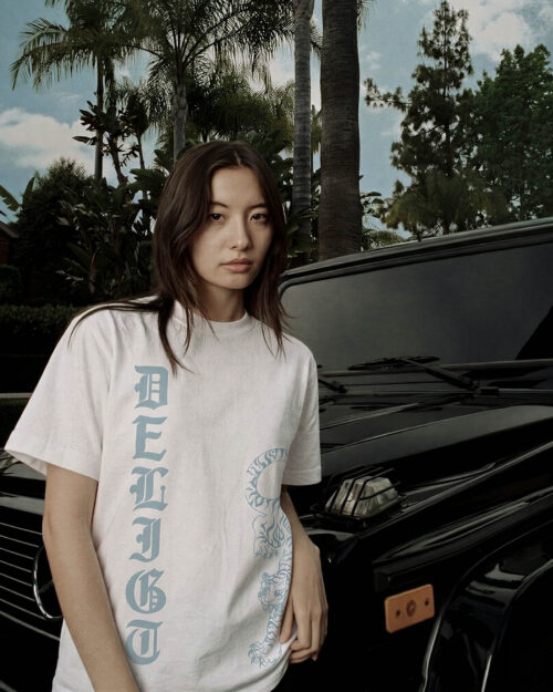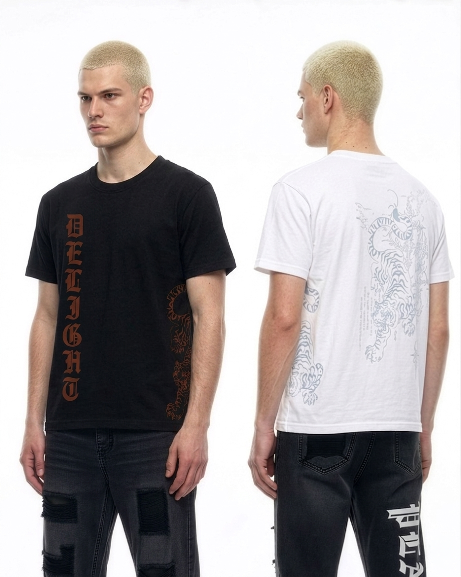 Mặt trước: Nổi bật với dòng chữ “DELIGHT” in dọc theo thân áo bên trái. Phông chữ Gothic (Cổ điển) màu hổ phách tạo cảm giác vừa mạnh mẽ, vừa cổ điển, làm tăng thêm sự huyền bí và cuốn hút cho thiết kế.